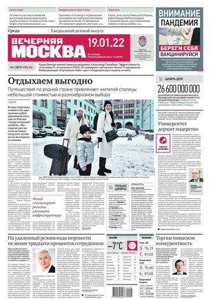 «Вечерняя Москва» — ежедневная российская вечерняя газета, старейшее из вечерних изданий в России, учрежденное в 1923 году. Выходит пять дней в неделю, кроме субботы и воскресенья. Отличается тем, что рассказывает о событиях еще не завершившегося дня. Оперативно освещает хронику и особенности жизни Москвы, охватывает все слои общества и большинство профессиональных и возрастных групп читателей.Издание представлено тремя выпусками – утренним ежедневным, вечерним (выходит три раза в неделю), еженедельным (выходит по четвергам).
