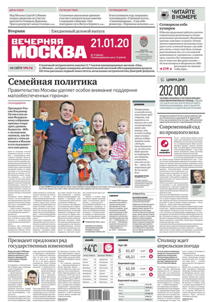 «Вечерняя Москва» — ежедневная российская вечерняя газета, старейшее из вечерних изданий в России, учрежденное в 1923 году. Выходит пять дней в неделю, кроме субботы и воскресенья. Отличается тем, что рассказывает о событиях еще не завершившегося дня. Оперативно освещает хронику и особенности жизни Москвы, охватывает все слои общества и большинство профессиональных и возрастных групп читателей.Издание представлено тремя выпусками – утренним ежедневным, вечерним (выходит три раза в неделю), еженедельным (выходит по четвергам).