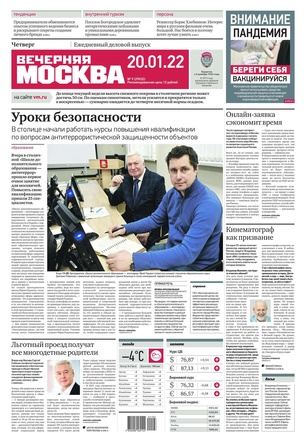 «Вечерняя Москва» — ежедневная российская вечерняя газета, старейшее из вечерних изданий в России, учрежденное в 1923 году. Выходит пять дней в неделю, кроме субботы и воскресенья. Отличается тем, что рассказывает о событиях еще не завершившегося дня. Оперативно освещает хронику и особенности жизни Москвы, охватывает все слои общества и большинство профессиональных и возрастных групп читателей.Издание представлено тремя выпусками – утренним ежедневным, вечерним (выходит три раза в неделю), еженедельным (выходит по четвергам).