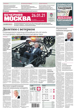 «Вечерняя Москва» — ежедневная российская вечерняя газета, старейшее из вечерних изданий в России, учрежденное в 1923 году. Выходит пять дней в неделю, кроме субботы и воскресенья. Отличается тем, что рассказывает о событиях еще не завершившегося дня. Оперативно освещает хронику и особенности жизни Москвы, охватывает все слои общества и большинство профессиональных и возрастных групп читателей.Издание представлено тремя выпусками – утренним ежедневным, вечерним (выходит три раза в неделю), еженедельным (выходит по четвергам).