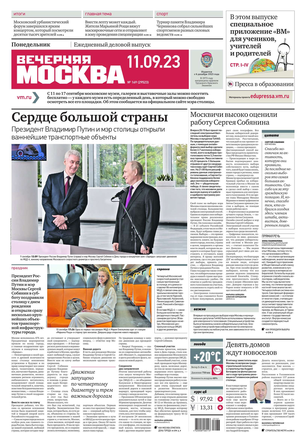 «Вечерняя Москва» — ежедневная российская вечерняя газета, старейшее из вечерних изданий в России, учрежденное в 1923 году. Выходит пять дней в неделю, кроме субботы и воскресенья. Отличается тем, что рассказывает о событиях еще не завершившегося дня. Оперативно освещает хронику и особенности жизни Москвы, охватывает все слои общества и большинство профессиональных и возрастных групп читателей.Издание представлено тремя выпусками – утренним ежедневным, вечерним (выходит три раза в неделю), еженедельным (выходит по четвергам).