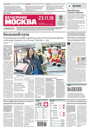 «Вечерняя Москва» — ежедневная российская вечерняя газета, старейшее из вечерних изданий в России, учрежденное в 1923 году. Выходит пять дней в неделю, кроме субботы и воскресенья. Отличается тем, что рассказывает о событиях еще не завершившегося дня. Оперативно освещает хронику и особенности жизни Москвы, охватывает все слои общества и большинство профессиональных и возрастных групп читателей.Издание представлено тремя выпусками – утренним ежедневным, вечерним (выходит три раза в неделю), еженедельным (выходит по четвергам).
