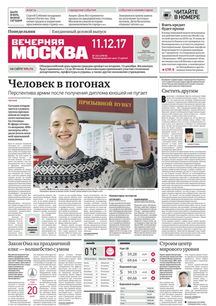 «Вечерняя Москва» — ежедневная российская вечерняя газета, старейшее из вечерних изданий в России, учрежденное в 1923 году. Выходит пять дней в неделю, кроме субботы и воскресенья. Отличается тем, что рассказывает о событиях еще не завершившегося дня. Оперативно освещает хронику и особенности жизни Москвы, охватывает все слои общества и большинство профессиональных и возрастных групп читателей.Издание представлено тремя выпусками – утренним ежедневным, вечерним (выходит три раза в неделю), еженедельным (выходит по четвергам).