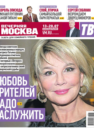 Еженедельный выпуск «Вечерней Москвы» — это значимые события недели, афиша города, новости из сферы отдыха и развлечений, телепрограмма с анонсами и комментариями, авторские колонки журналистов и авторитетные мнения экспертов, детская страничка, специальная рубрика «Золушка», интересные репортажи о необычных судьбах московских жителей, постоянные конкурсы и викторины.