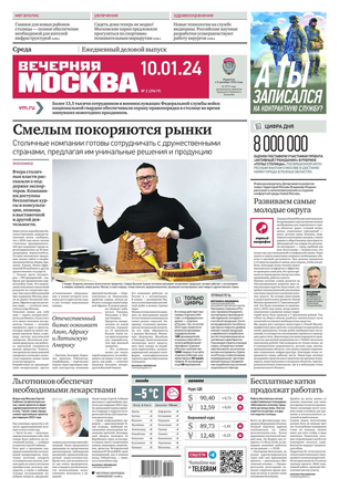 «Вечерняя Москва» — ежедневная российская вечерняя газета, старейшее из вечерних изданий в России, учрежденное в 1923 году. Выходит пять дней в неделю, кроме субботы и воскресенья. Отличается тем, что рассказывает о событиях еще не завершившегося дня. Оперативно освещает хронику и особенности жизни Москвы, охватывает все слои общества и большинство профессиональных и возрастных групп читателей.Издание представлено тремя выпусками – утренним ежедневным, вечерним (выходит три раза в неделю), еженедельным (выходит по четвергам).
