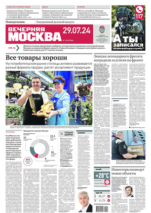 «Вечерняя Москва» — ежедневная российская вечерняя газета, старейшее из вечерних изданий в России, учрежденное в 1923 году. Выходит пять дней в неделю, кроме субботы и воскресенья. Отличается тем, что рассказывает о событиях еще не завершившегося дня. Оперативно освещает хронику и особенности жизни Москвы, охватывает все слои общества и большинство профессиональных и возрастных групп читателей.Издание представлено тремя выпусками – утренним ежедневным, вечерним (выходит три раза в неделю), еженедельным (выходит по четвергам).