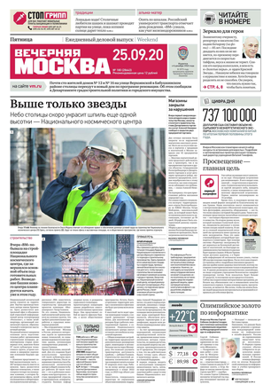 «Вечерняя Москва» — ежедневная российская вечерняя газета, старейшее из вечерних изданий в России, учрежденное в 1923 году. Выходит пять дней в неделю, кроме субботы и воскресенья. Отличается тем, что рассказывает о событиях еще не завершившегося дня. Оперативно освещает хронику и особенности жизни Москвы, охватывает все слои общества и большинство профессиональных и возрастных групп читателей.Издание представлено тремя выпусками – утренним ежедневным, вечерним (выходит три раза в неделю), еженедельным (выходит по четвергам).