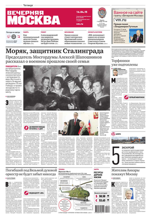 «Вечерняя Москва» — ежедневная российская вечерняя газета, старейшее из вечерних изданий в России, учрежденное в 1923 году. Выходит пять дней в неделю, кроме субботы и воскресенья. Отличается тем, что рассказывает о событиях еще не завершившегося дня. Оперативно освещает хронику и особенности жизни Москвы, охватывает все слои общества и большинство профессиональных и возрастных групп читателей.Издание представлено тремя выпусками – утренним ежедневным, вечерним (выходит три раза в неделю), еженедельным (выходит по четвергам).